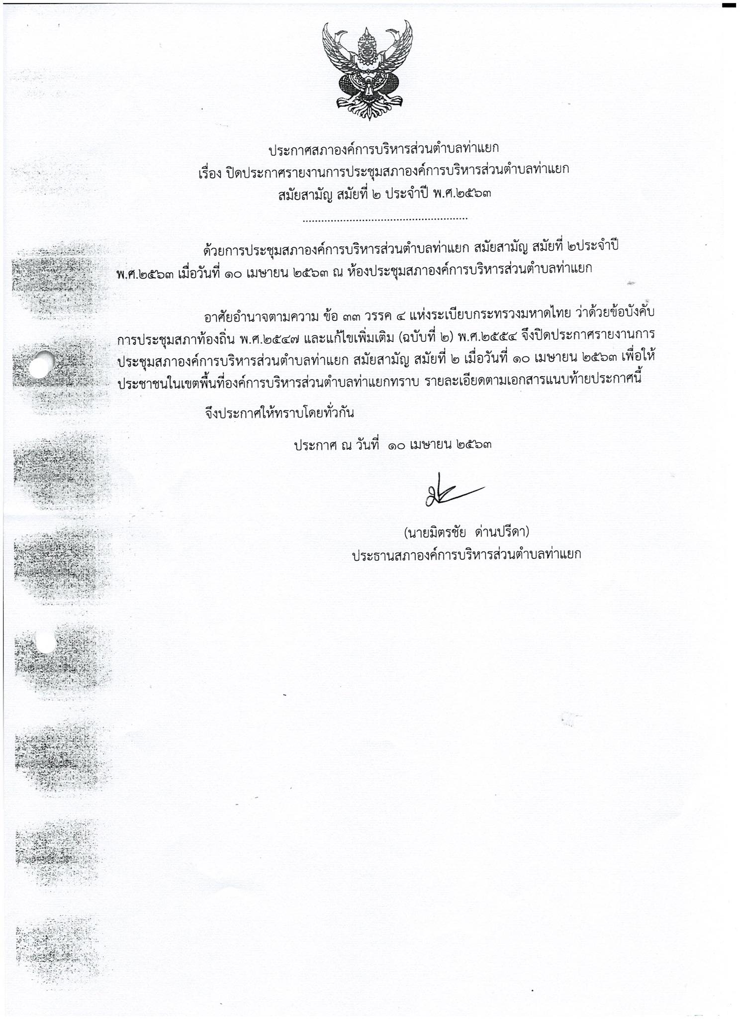 ประกาศองค์การบริหารส่วนตำบลท่าแยก เรื่อง ปิดประกาศรายงานการประชุมสภาองค์การบริหารส่วนตำบลท่าแยก สมัยสามัญ สมัยที่ 2 ประจำปี พ.ศ. 2563 |